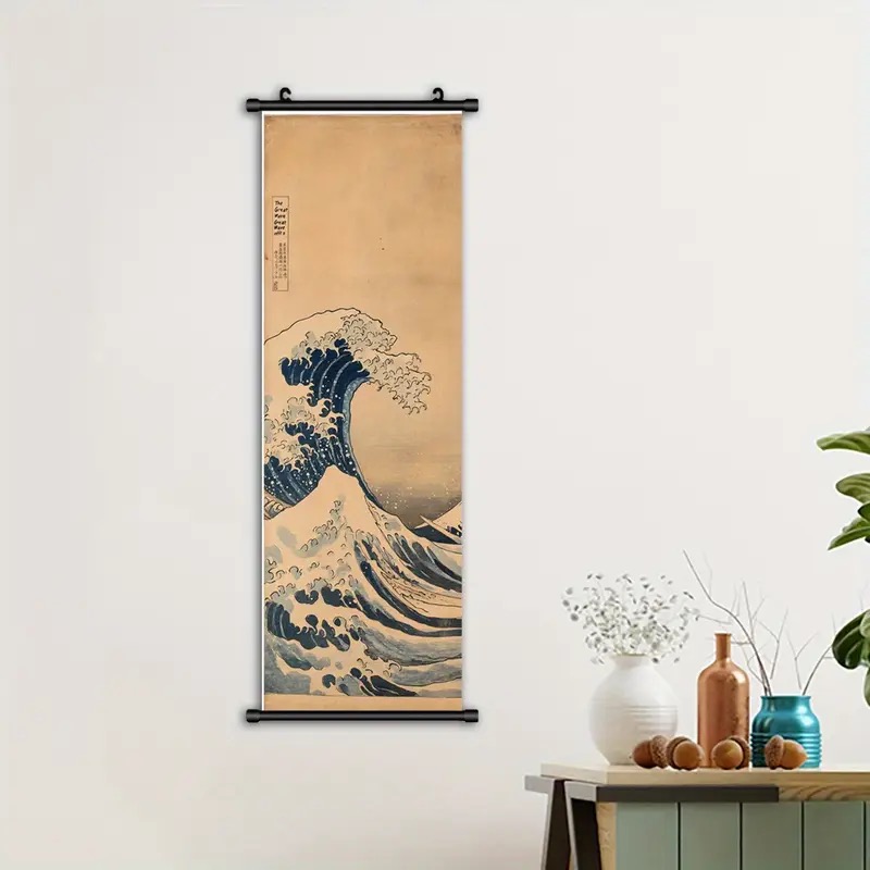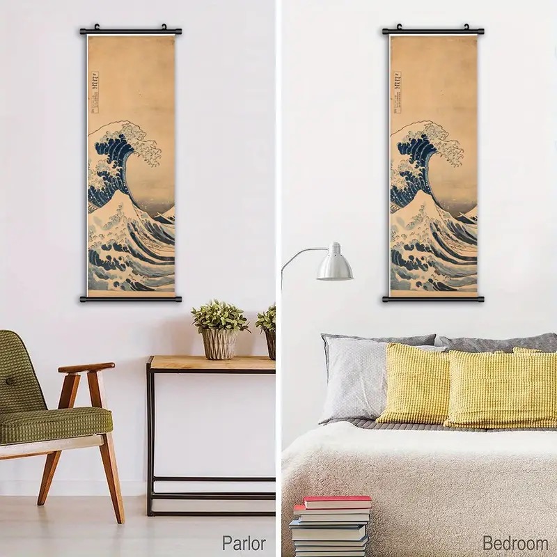 1pc Great Wave off Kanagawa Canvas Wall Art – Japanese Style Scroll Painting Poster with Black Frame and Hanger